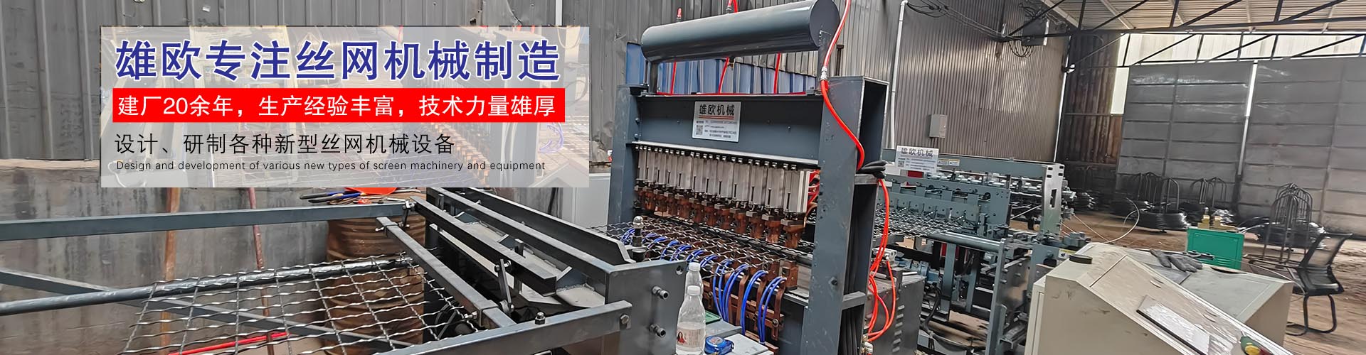 安平县雄欧丝网机械有限公司位于著名的“丝网之乡”---河北省安平县,专业从事设计、研制各种新型丝网机械设备和生产各种丝网。雄欧网业机械研发丝网机械已有20余年,凭借专业的制作水准与完善的售后服务,深受广大客户的赞同和信赖。雄欧网业机械主要产品有:数控半自动勾花机械、数控全自动勾花机械、数控保温网机械、数控食品网机械、全自动经纬网机械、直丝机机械、数控全自动网片焊接机械、汽车坐垫网机械等机械类产品,同时还有金属网带、装饰网、涂塑丝、勾花网、支护网片、金属线材、煤矿支护网、体育场用网、边坡防护网等丝网产品。产品用途广泛、规格齐全。以优良的质量和贴心的服务赢得了广大客户的好评 ...
